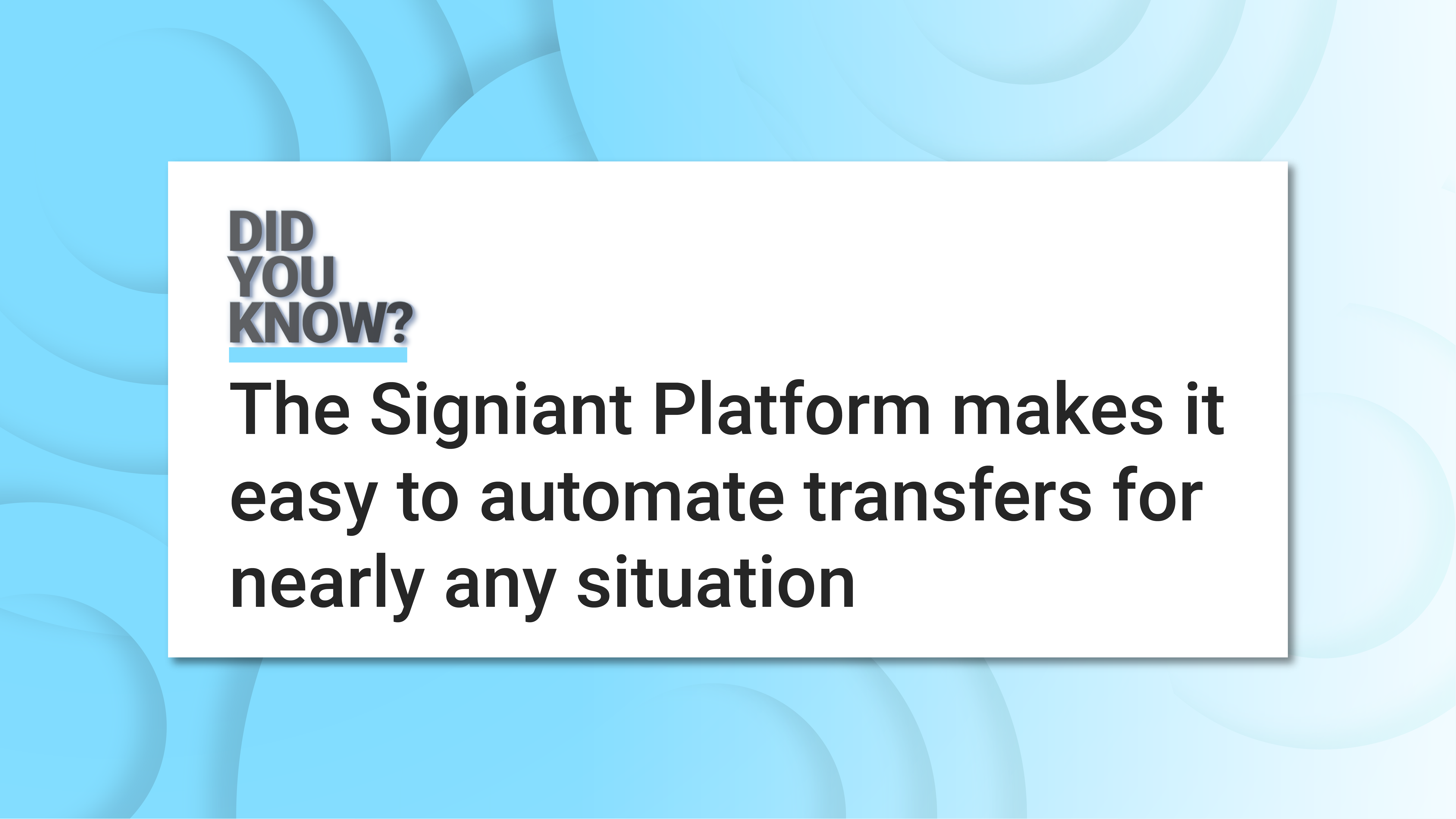 Did You Know — the Signiant Platform makes automating file transfers easy and adaptable to nearly any situation? Signiant Jet, part of the Signiant Platform, offers businesses of all sizes powerful yet simple automated transfer solutions. Whether it’s moving files between locations, with partners, or to and from any major public cloud, Signiant Jet has you covered.